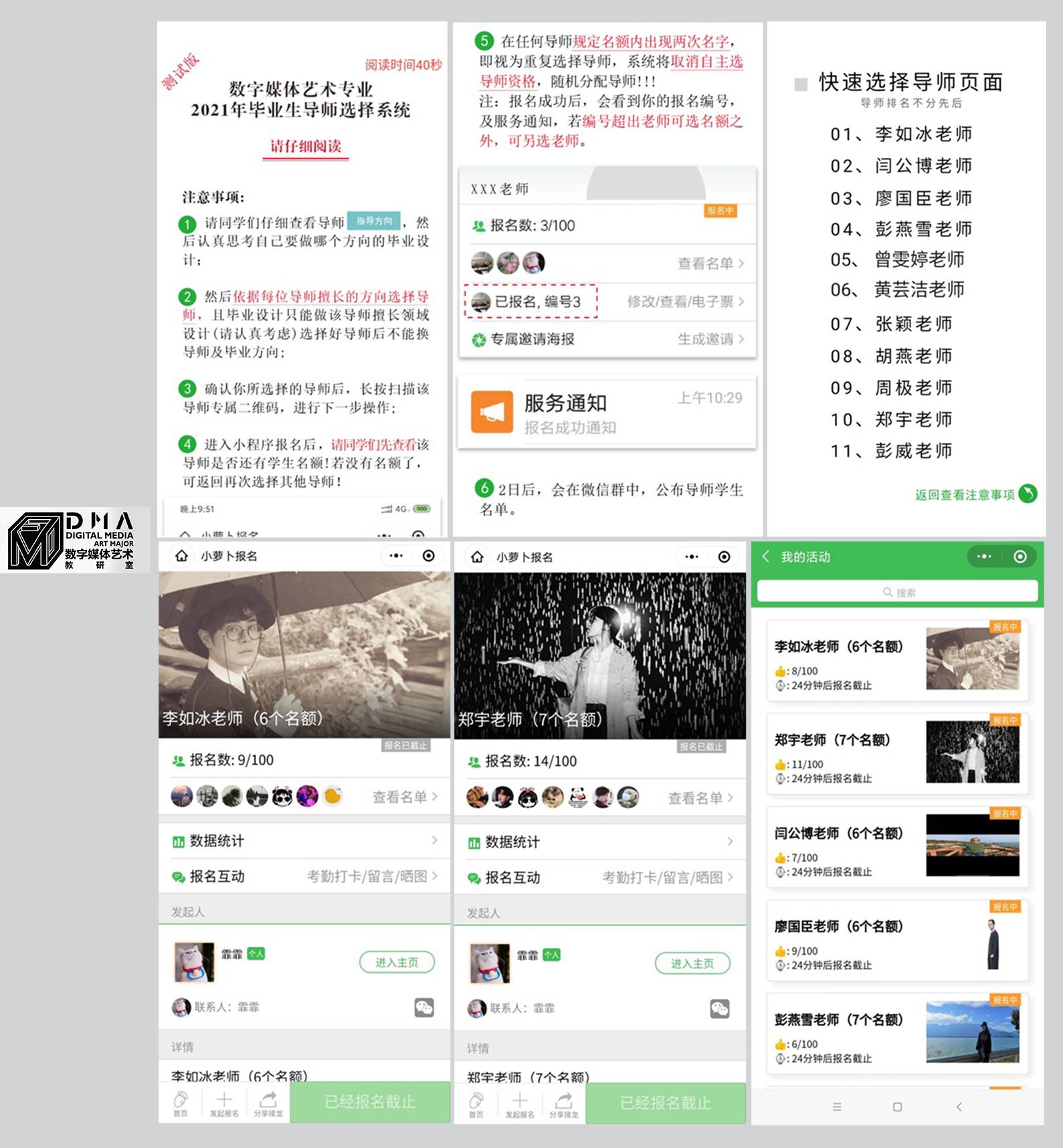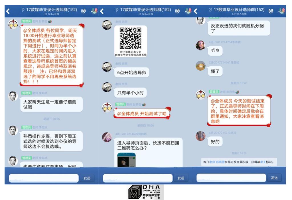 之后会议针对明年准毕业生选择毕业导师的工作进行了详细讨论与后期工作安排,本次准毕业生选择导师的方式为:学生在了解各导师毕业设计辅导方向后,统一在小程序中进行自主导师选择。教研室的胡燕老师对此次选择导师的程序进行了充分的前期准备,并在会议前多次与李主任商讨。因此在本次会议中选择导师程序已制作得较为完善,教研室所有老师在会议中即刻对程序进行操作与测评,并且讨论程序中可以继续完善的版块、提出学生须知条款中的措辞修改建议等等,最终敲定本次选择导师程序中的所有内容。而后将程序二维码发送到明年毕业年级的大群里,让全体学生对程序进行“测试”,也让全体学生对选择导师程序的相关操作进行熟悉,以便在正式选择时能正确使用程序。在测试过程中,同学们也对自己遇到的问题进行询问,老师们也耐心地进行讲解与提醒,希望同学们能在下周正式选择导师时,考虑好自己喜欢的毕业设计创作方向并选择到自己心仪的导师。