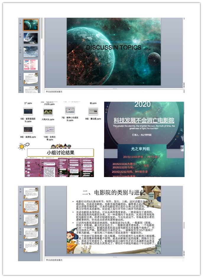 老师们坚持“以学为中心”的教育理念,为了促发学生们自主学习的积极性。比如韩鹏伟和陈霞老师就布置了学习任务:以小组讨论为形式,小组成员用PPT来进行课堂陈述。通过尝试,老师们发现学生具有较强的自学能力:学生线下小组讨论较为充分,PPT制作较为精美,小组成员分工明确,课堂陈述小组观点时表达较为流畅,内容比较充实。以学习任务为驱动的教学方式,不仅让学生成为了课堂的主角,还充分锻炼了学生的表达能力,展示了他们的风采。