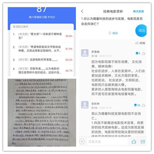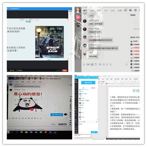 疫情的到来,让老师们的授课面临诸多挑战。在网课开展以前,通识部艺术课程教学团队的6位老师们多次对《音乐剧》、《古典音乐入门》和《经典电影赏析》课程的网课开展方式进行研讨,积极响应 “以学为中心”的教育理念。老师们最终采用了在线软件直播+群文件教学资料分享+超星APP结合的授课模式。经过师生们的努力,网课有序进行,从教师与学生的互动,到学生成为课堂主角,再到学生们完成的较高质量的作业,艺术课程的线上授课呈现出了良好的效果。