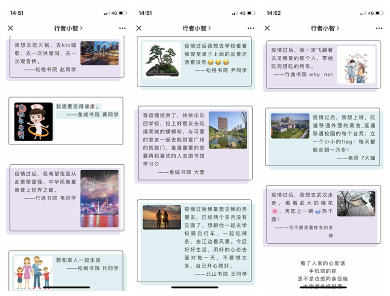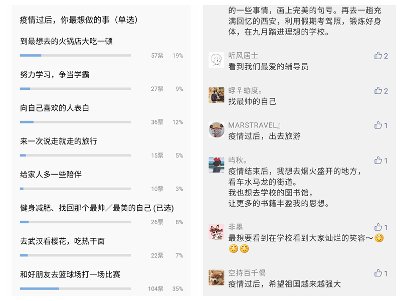 3月26日,此次活动征集到的话题在智能工程学院官方微信公众号“行者小智”上进行展播,与此同时,书院群又一次在展播作品的文章中发起了新一轮的“疫情过后,我想……”话题在线投票及留言活动。在线投票及留言活动推出以后,297人次参与投票,11人次进行了在线留言,再一次进行了“云端”共享美好心声!