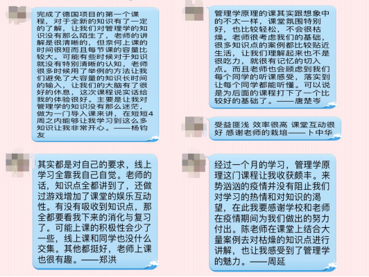 2月24日《管理学原理》首先敲开疫情期间FOM本硕连读国际班硕士预备课程网课的大门,通过课堂上大量的实际案例,改变传统讲授枯燥知识点的教学方法,用轻松活跃的课堂氛围,用严谨的教学内容让同学们感受到管理学的魅力。一个月的在线学习和交流让陈晓曼副教授和同学们隔着屏幕建立了特殊的师生情。3月20号,最后一节课同学们纷纷表达对陈老师的尊敬和喜爱,同时表示这门课深度激发了他们对管理学的热情。