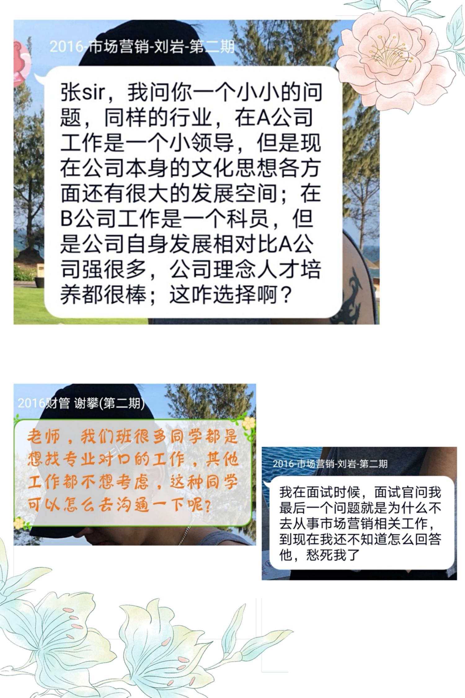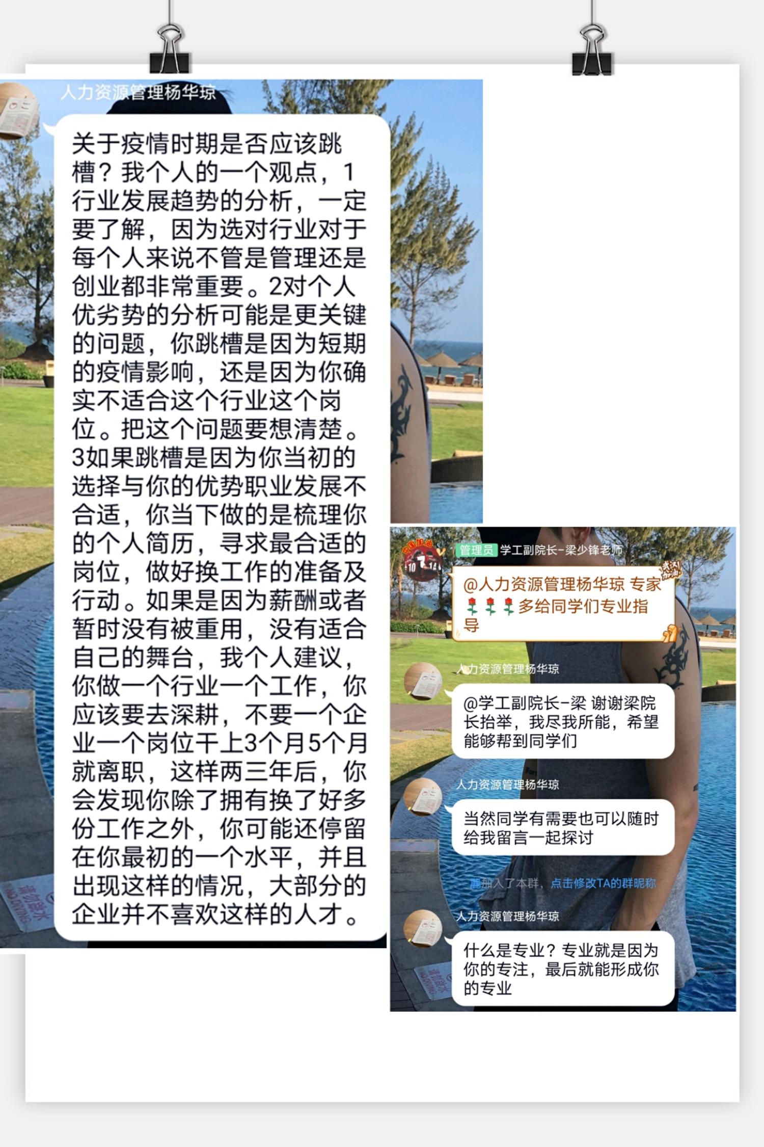 又是一年毕业季,萦绕在大四学子身边的有机遇、忙碌和迷茫。大四学生毕业后应如何选择,是直接工作还是考研或考公务员?针对此问题,秦春蓉老师指出,不管从事任何行业、任何岗位,都应尽心尽力,就像习近平总书记对新时代新青年提出的要求一样,做事情要有始有终,要有责任,要有担当,这也正是学院老师们所想传递给学生们的思想。梁少锋老师认为,之所以有疑虑是因为自身对某行业或职业还不够了解,才看不清楚自己未来的出路。面对未来的诸多不确定、无限的机遇,彷徨是不可能找到彼岸的,现在真正要做的就是抓住机遇,迎接挑战,不断提升自己,打造未来生活的蓝图。针对疫情期间是否应该跳槽的问题,杨华琼老师认为首先要对自己现在所处行业进行趋势分析,然后对个人能力进行优劣势分析,最后如果是因为工作与自己职业规划不符合,就应该重新梳理个人的简历,然后去寻求合适的岗位。杨老师强调,做一行应深耕,经常离职在几年之后就会发现自身能力还停留在原地。专业对口问题也是困扰毕业生的一大难题,部分学生执着于找专业对口的工作,导致错失很多就业机会。张平老师认为,这个世界是以解决问题而存在的,不是以专业而存在的,专业是为生活完满服务的,我们应该以市场去找专业而不是以专业去找市场。