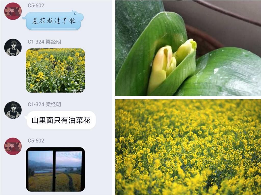 “小宝宝们,好久不见,都在家待闷了吧。我家有一个天然后花园,现在都在陆陆续续出新芽、开花了,很有生机,我给大家开视频观赏一下,让你们体验体验在家也能看不一样的风景,感受春天的气息。”北山书院3号楼501女生寝室的张娜娜同学活泼、打趣儿地为其他寝室的同学介绍道。她的室友王家秀同学,也是一名花卉爱好者,尤其喜欢睡莲,一边分享着她种植的睡莲照片,一边给其他同学普及睡莲和其他花类品种的养植方法,如一本花卉“百科全书”一般,在个人养花兴趣上有很多的经验和干货。