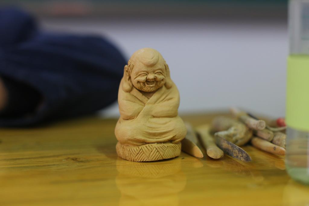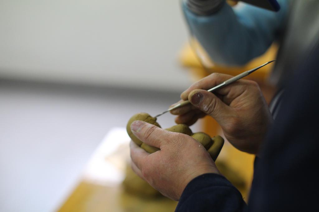 课堂上,刘老师也向同学们阐释了他心目中泥塑的内涵:“它的意义远不止土制工艺品这么简单,在作品的创作与思考中也包含了前人的经验与智慧。”在结束理论课程的学习后,刘明君老师开始向同学们展示泥塑品的手工制作过程,并且让同学们尝试着自己去动手制作一尊人物塑像。