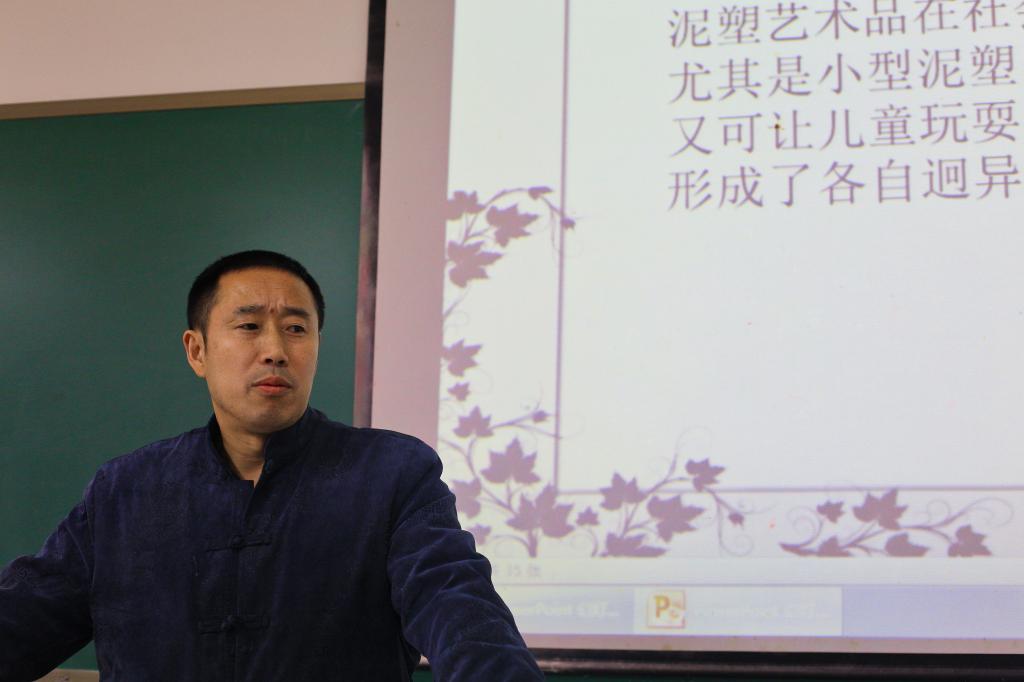 刘明君先生和他的助理向同学们介绍了泥塑技艺的发源历史和存在价值,因为泥是天然易得的材料,所以泥塑很容易就受到了人民群众的喜爱。泥塑代表的不仅仅是一项普通的民间技艺,更是满含了制作者的辛劳和情感。
