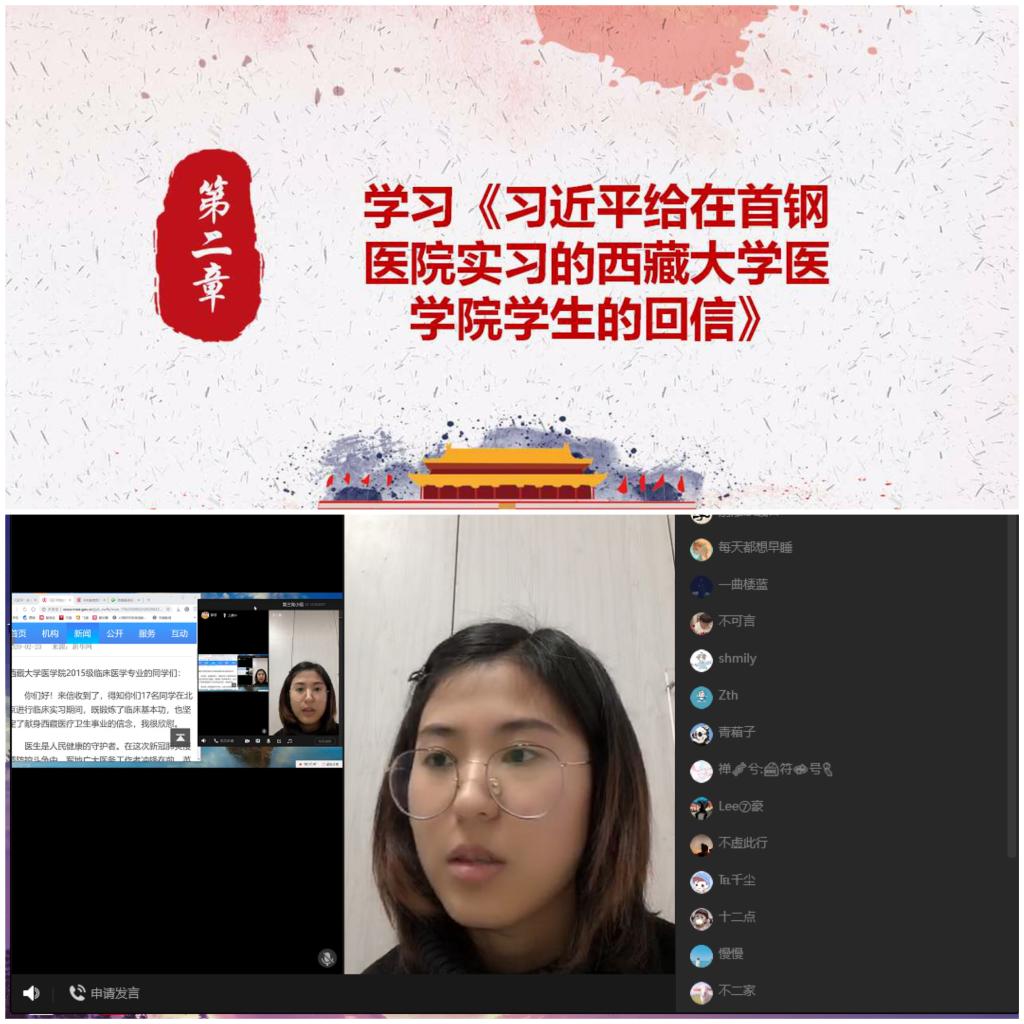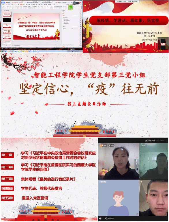 为进一步激发青年学生党员的责任担当,深入推进爱国主义教育,发挥广大党员的先锋模范作用。3月19日,智能工程学院学生党支部围绕“让青春在战疫中绽放,让责任在行动中闪亮”这一主题开展了线上主题党日活动。本次活动以党小组形式进行,会议通过学习《习近平在中央政治局常委会会议研究应对新型冠状病毒肺炎疫情工作时的讲话》和《习近平给首钢医院的西藏大学医学院的回信》等文件精神,各小组成员分享学习心得。本次主题党日活动由第一党小组组长蓝剑锋同志、第二党小组组长刘桃同志、第三党小组组长郭菲同志分别主持,智能工程学院学生党支部全体成员参与。