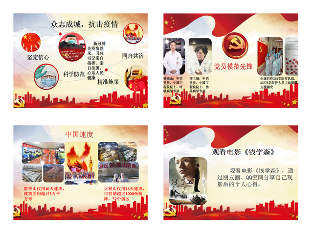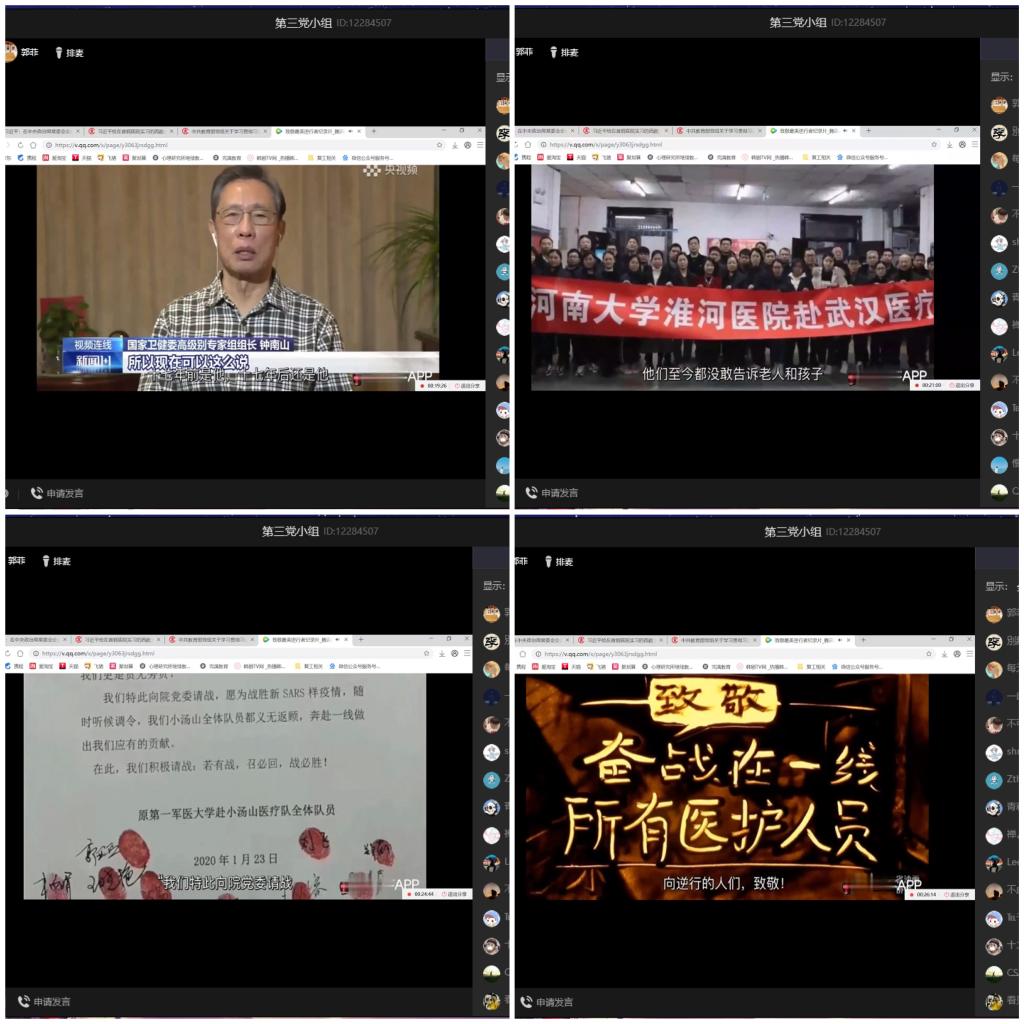 第一党小组的会议主题是“强化防疫意识,大学生勇于担当”;第二党小组的会议主题是“战疫情,学讲话,观红影,悟党性”;第三党小组的会议主题是“坚定信心,‘疫’往无前”。各小组组长通过领学《习近平在中央政治局常委会会议研究应对新型冠状病毒肺炎疫情工作时的讲话》,使大家对目前全国的疫情防控形势有了更清晰的认识,对防控中的注意事项和方向更加明确,对战胜疫情的信心更加坚定。紧接着,各小组在学习《习近平给在首钢医院实习的西藏大学医学院学生的回信》后开始分享感悟,吴家家老师谈到:疫情中涌现出很多青年的身影,也包括智能工程的志愿者们,都在为疫情防控贡献微薄之力。让她感触最深的是一名西北工业大学藏族女学生,在寒冷的山顶中靠着微弱的信号学习网课,希望我们现在的青年党员严格要求自己,拥有当代大学生坚毅的态度。