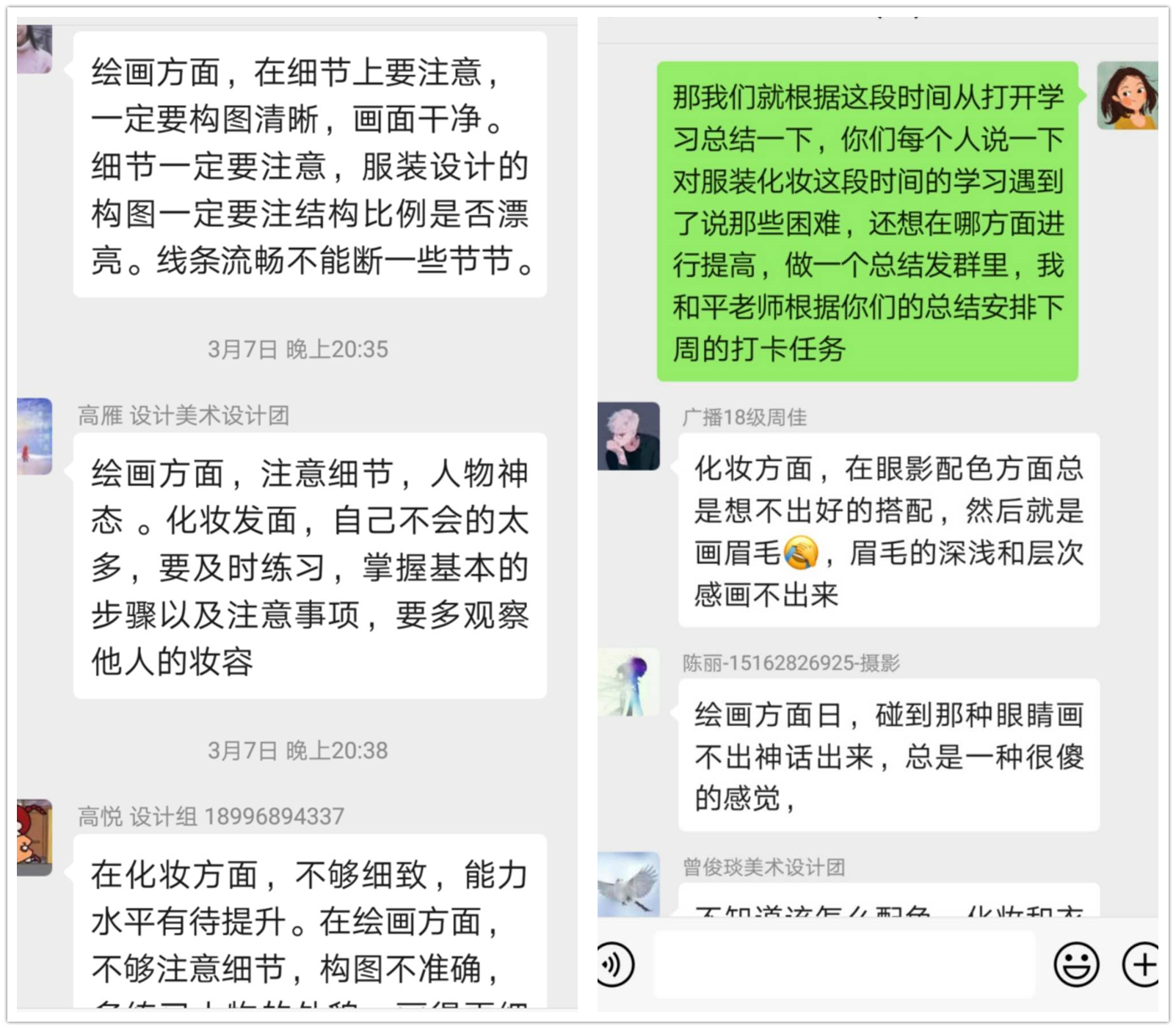 来自广编2018级的同学周佳坦言,记得第一天的美妆练习,因为不懂色彩搭配,只是凭感觉凭看过的素材描绘,最后出现的作品会感觉没有灵魂。在李聪老师的指导下,她最明显的感触是:你在做东西的时候,会用心去体会,用心去挖掘美的出处、美的创作之法,更多的是美的习惯的养成,要想创作美,你自己身必须先认识美,把自己美起来。周佳的改观是具体的,在接下来的课程里,她克服的困难还很多,但她最愿意分享的是第一天的经历,“我觉得能够让一个小白产生最伟大的感觉,不是这个作品好棒,我要好好努力,而是——原来我也可以。”