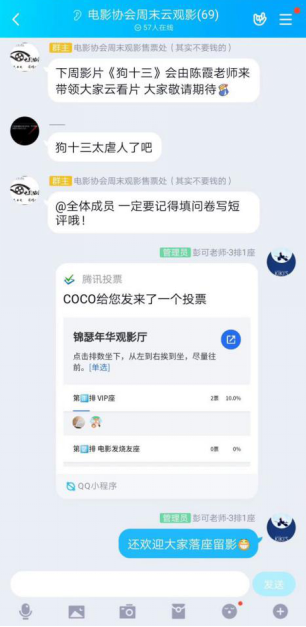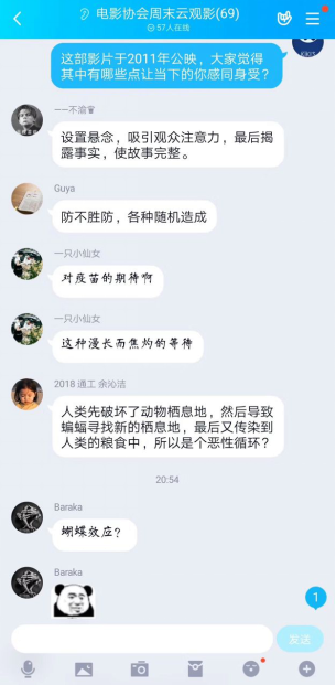 3月8日,受战役特刊的广泛响应,电影协会特推出“小影云影院”活动,邀请移通学子居家抗疫一起“云”看片,线上交流观影心得,每期邀请神秘嘉宾坐镇。结合疫情,推出首期排片——《传染病》,活动参与人数达70人,邀请到重庆邮电大学移通学院远景学院教师彭可老师为大家分享交流,让移通学子感同身受的同时,思考这次疫情带给人类的警示。