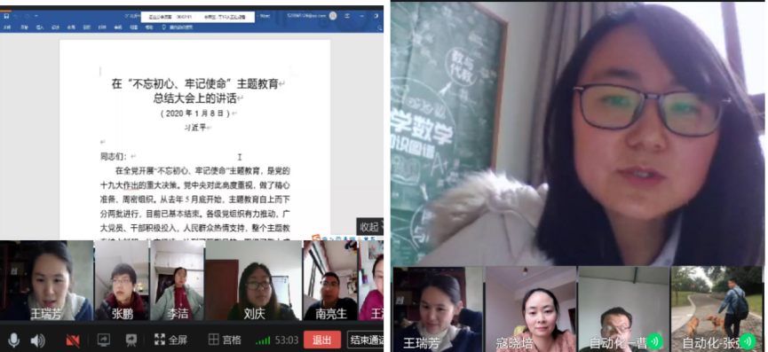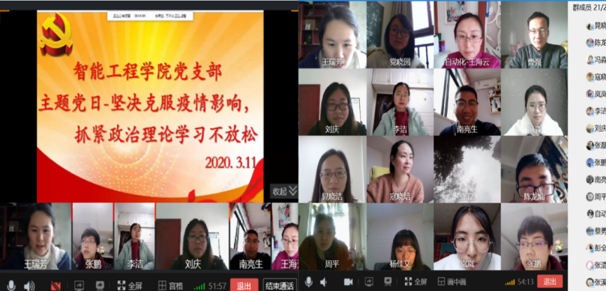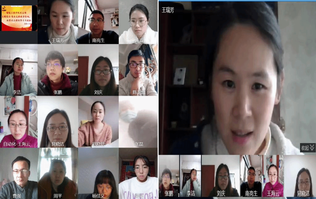 在当前疫情防控背景下,为了继续推动党员的学习与进步,加强党建引领,在特殊时期发挥基层党支部在疫情防控工作中的战斗堡垒作用,3月11日下午,智能工程学院党支部召开线上主题党日活动:坚决克服疫情影响,抓紧政治理论学习不放松。支部书记王瑞芳同志主持了此次活动,支部全体党员相聚线上,共同参与了集中政治理论学习。