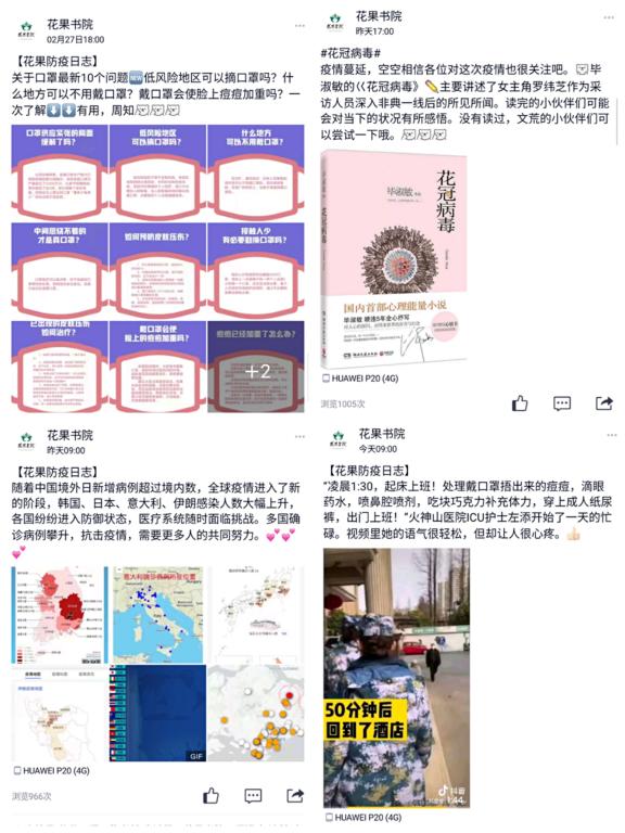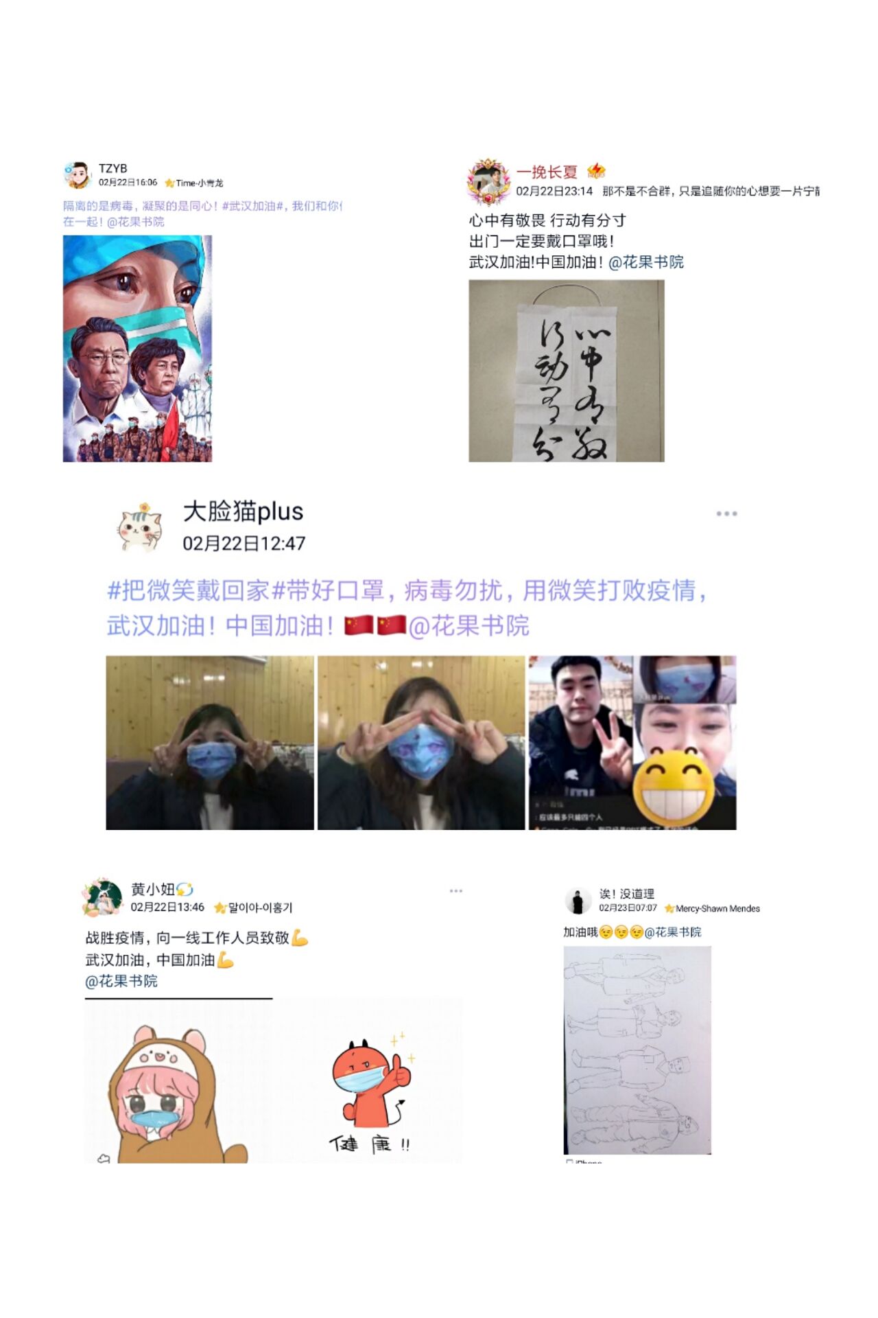花果书院新学期的工作也渐入佳境,经过了一个足不出户的假期,花果书院的老师同学们都干劲十足,即使是在家里,也拿出最好的精神状态投入了新学习与工作中。在过去的第一周里,花果书院官方QQ号和官方微信公众号依旧遵循“一日一更”的原则,官方账号除了推送专栏“防疫日志”外,也推送了其他较为放松的推文来放松同学们的心情。同时,花果书院举办的“微笑抗疫——把微笑戴回家”活动依旧如火如荼的进行着。同学们将自己对中国、对武汉的祝福画在了自己的作品里,同时,参加过的同学们也带动身边的亲人、朋友、同学参与到其中,这不仅仅是同学们对自己的乐观与信念的传递,更达到了提高同学们感召力的目的。