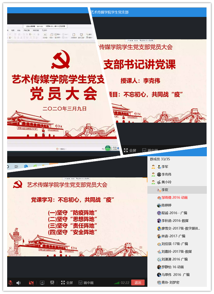 面对新冠肺炎疫情,为更好发挥基层党组织的先锋模范作用,做好党员同志的日常教育,促进师生党员树立责任意识、担当意识,为共同战“疫”做出应有的贡献,艺术传媒学院学生党支部于2020年3月9日19:00,以网络形式召开了支部党员大会。学生党支部全体党员同志参与,会议由学生党支部副书记李军老师主持。