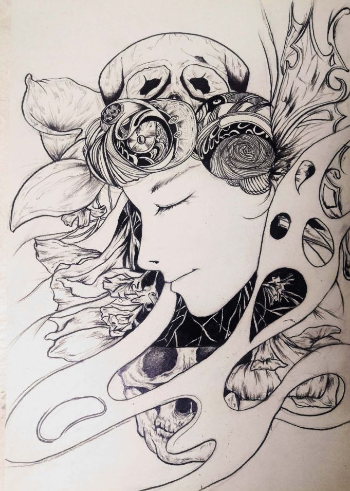 作品《heroes in harm's way》画中的女子就是逆行者——白衣天使,右上方有蝴蝶的翅膀代表着生机和战胜疫情的信心,左边的花蕊是代表着希望之花 ,愿春暖花开之时早日到来。而在白衣天使后面有骷髅头的设计,是寓意白衣天使们用生命挡在我们与恶魔之间,守护着我们的家园。最前面缠绕在骷髅身边的像飘散的烟一样的设计,是希望疫情可以早日烟消云散。而取名《heroes in harm's way》是王外长在慕尼黑安全会议上发表演说提出来的概念,是用来专指我们的逆行者——白衣天使们,致敬逆行者。