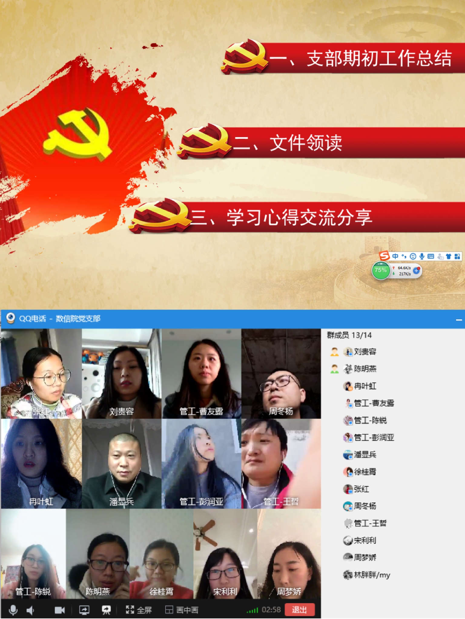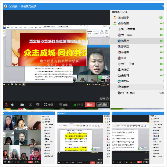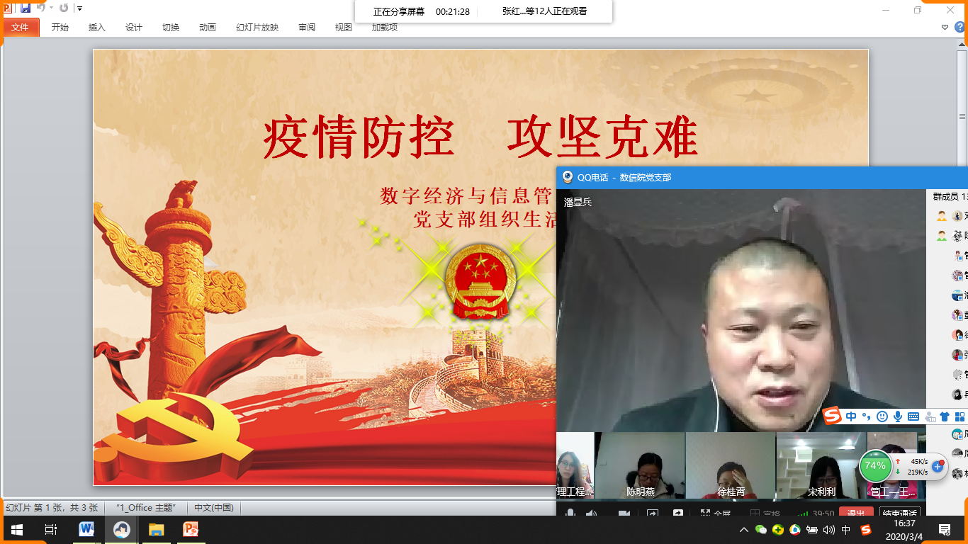 疫情当前,对基层党组织和广大党员干部而言,最重要的就是要切实发挥党组织战斗堡垒和党员先锋模范作用,筑牢打赢疫情防控阻击战的政治防线,为打赢疫情防控阻击战提供坚强政治保证。在数字经济与信息管理学院党总支书记潘显兵的指导下,学院两个支部分别于3月4日召开了线上组织生活会。此次组织生活会以基层党支部为单位,主要通过“学习强国”APP中“强国视频会议”、QQ视频两种方式进行。