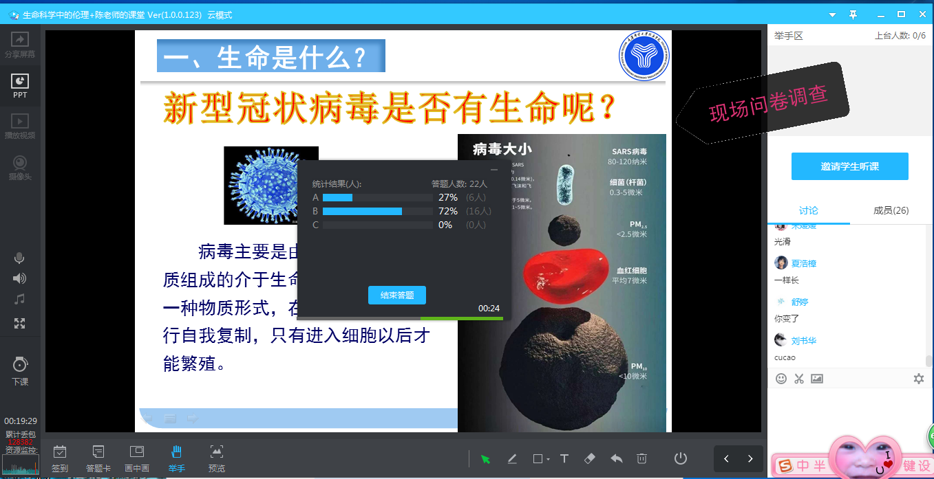 哲学2教学团队本学期开设了《生命科学中的伦理》课程,第一节课上,老师就启发学生针对“新冠肺炎涉及的伦理思考”这个问题进行探讨,极大地调动了学生们的讨论热情。同学们踊跃发言,“人与自然、人与动物应和平相处,远离野生动物”,“尊重自然,敬畏生命,远离病毒”、“如何做一个遵守道德原则的人”、“向逆流而上的英雄致敬”,同学们的讨论热情比平时授课的气氛有过之而无不及。