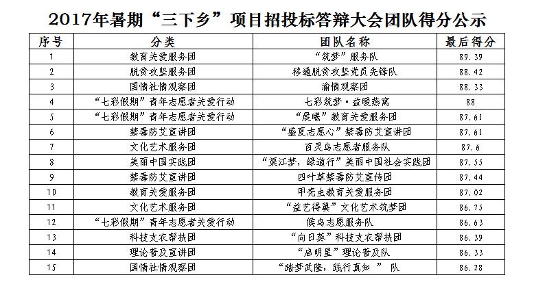 本次暑期“三下乡”项目招投标答辩大会取综合得分排名前15个团队进入校级团队(包括市级团队),并按综合分,分为A、B、C三类,其中A类占20%,将获得经费资助4000元,并根据情况推荐为市级团队;B类占40%,将获得经费资助3000元,并根据情况挑选部分团队推荐为市级团队;C类占40%,将获得经费资助2000元,确定为校级重点团队。并在2017年9月三下乡队伍将进行成果汇报、组织答辩、现场成果展示。对在“三下乡”期间表现突出的团队和个人集中表彰,组织召开“三下乡”表彰总结大会。