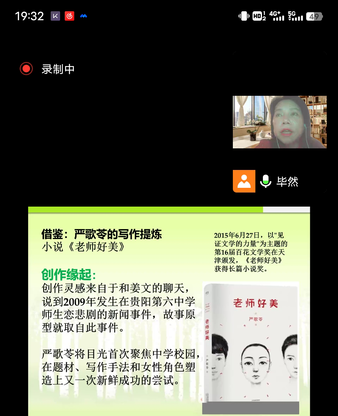 进入腾讯直播教室,精致的PPT温馨扑面,毕然老师已经等在直播教室里了。课程开始,毕然老师笑着和线上的同学们打招呼,让大家倍感亲切,随即又将自己在不久前不慎感染新冠患病的经历分享给学生,给在寝室隔离的同学们加油打气。毕然老师讲话娓娓道来,亲切和蔼的语言迅速震撼了听课的同学们,让大家立即凝聚起了注意力。紧接着,毕然老师展示了这节《创意写作思维训练》课程的主题——《练就一双火眼金睛》。毕然老师说:“相信每个同学都有写作的想法,但是写什么,什么可以进入创作视野,相信大家都会有点迷茫,今天这节课首先会引导你如何从身边发生的事情,从社会新闻,去提炼素材,找到属于自己的点来创作小说,同时也将探讨如何创作小说的大纲、故事梗概等,从这节课开始,各位同学可以开始着手准备自己的小说作品。”
