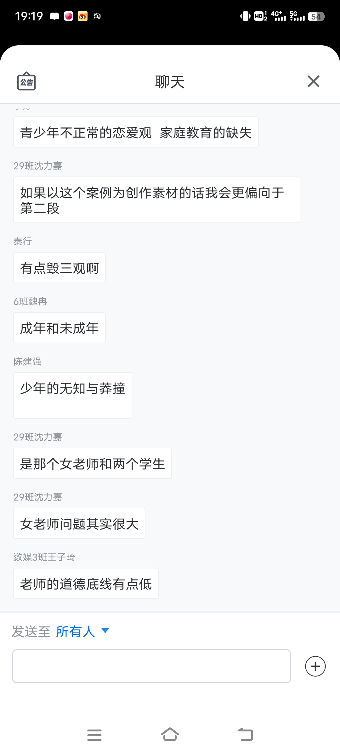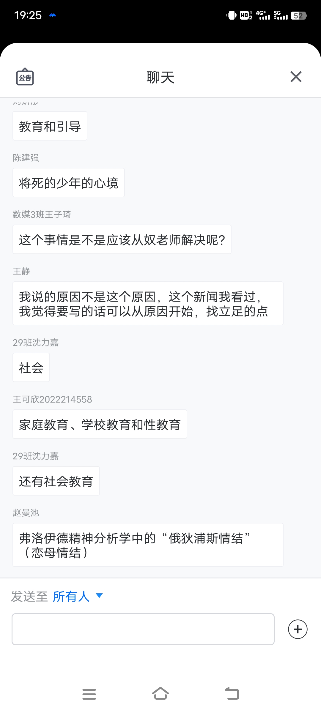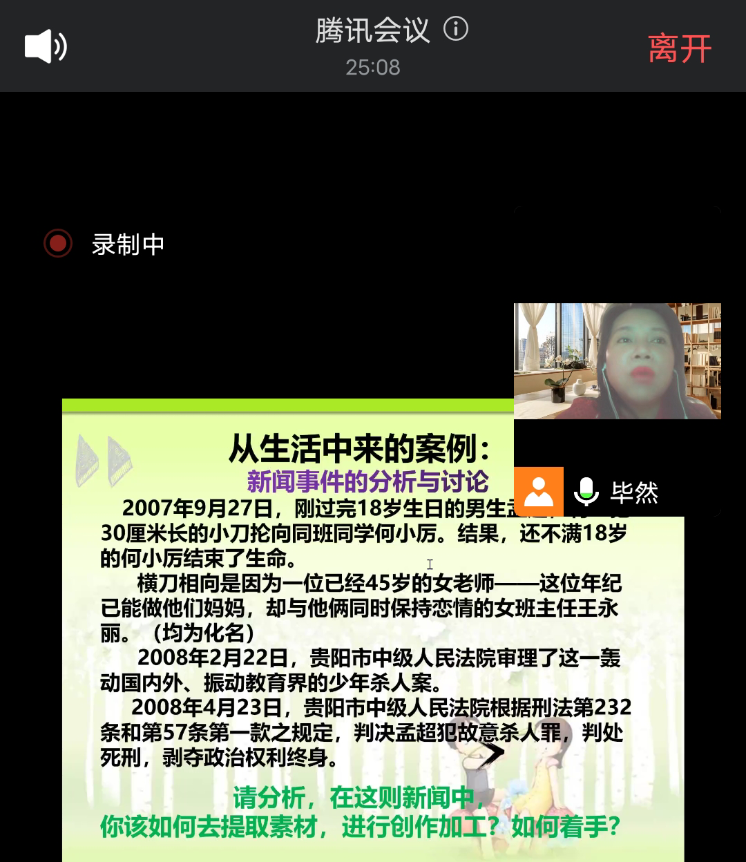 为了帮助同学们更好理解寻找、提炼素材的技巧,毕然老师先用了一例国内的新闻事件,校园师生关系的三角恋导致的恶性事件。毕然老师用启发的形式向同学们提问,当看到这样的新闻,我们作为一个写作者该如何提取其中的素材,该怎么“下手”?同学们的反应积极,大家通过互动面板,从家庭、社会、学校三方面的教育反思入手,从社会对个体的影响,从少年心境转变和成长过程中的问题等各方面阐释了自己的观点,大家的思维和观点在屏幕上不断地闪现和碰撞,激烈的讨论中擦出了绚烂的创作与智慧的火花。