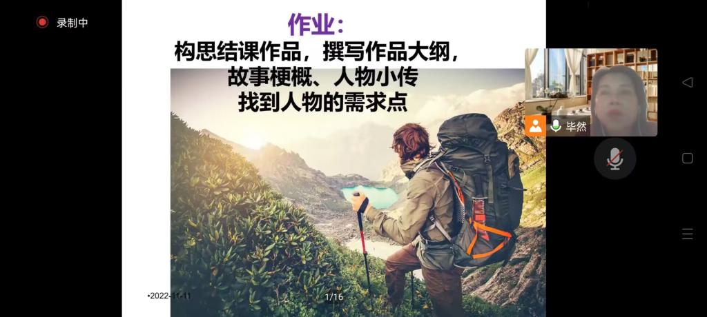为了在严峻的疫情形势下激发作家班学生的创造力,增进作家班工坊之间的情感联络,激发学生们的学习热情,11月11日晚七点,2022级作家班的儿童文学工坊、严肃文学工坊和非虚构工坊三大工坊的学生与助教,约五十余名学生进入了同一场腾讯会议,共同倾听由创意写作学院的毕然老师带来的线上写作课程《创意写作思维训练》。毕然老师是学院的资深一线教师,又是国家一级作家,具有丰富的写作和教学实战经验,同时《创意写作思维训练》也是毕然老师在2016级首届创意写作实验班最先开展的课程,积累了很多宝贵经验,大家都很期待毕然老师的课。