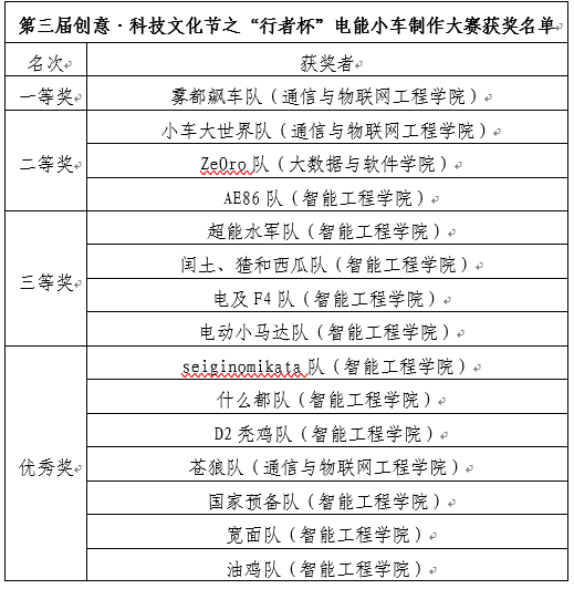 为培养未来新工程师,加强广大学生的科技创新素质培养,激发学生专业学习兴趣,切实锻炼学生的工程实践能力,增强学生创新意识。进一步推动专业教育+完满教育的深度融合。由共青团重庆邮电大学移通学院委员会主办、智能工程学院承办,通信与物联网工程学院、北山书院学生自治委员会协办的第三届创意科技文化节“行者杯”电能小车制作大赛于2019年10月13日在各个主干道正式启动报名工作,2019年11月14日在天渠111报告厅对竞赛中表现优异的同学进行表彰,本次学科竞赛圆满落幕。