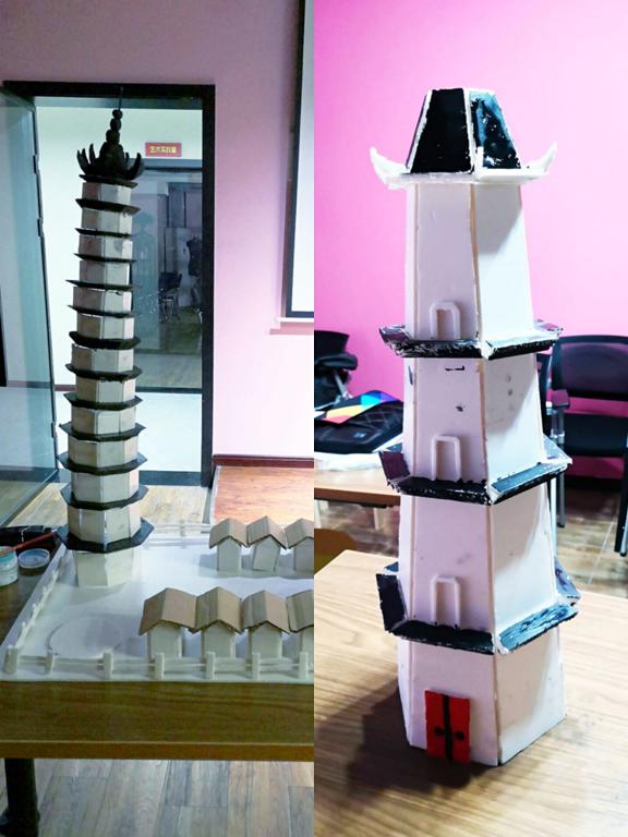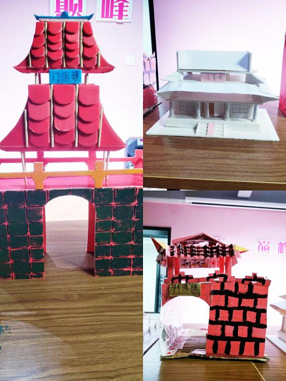 经过20分钟的制作,各组都已经完成了作品。每组作品都给人一种独特的韵味,别出心裁。第一组的文峰塔,是经过测量和预算,按照实际建筑的比例进行缩小,并运用充电宝在塔中搭建了一根灯管,同时模拟出四周的景象,整体极为逼真。第二组的作品也是塔,有五层之高,笔直矗立着,塔边黑色的轮廓与塔身对比强烈。第三组则是钓鱼城护城门,材料选用了纸牌,用扑克牌进行组装,制作出红色的城门,古色古香。第四组的彩龙门也是别具一格,分上下两部分组成,用牙签和双面胶固定,城墙为红,黑色的马克笔勾勒出红砖。第五组是乡间祠堂,简单大方,视觉逼真感十足,祠堂大门上悬挂着一个匾额,揭示作品名为“凌霄阁”。每一个作品,都从不同的角度,融入自己的理解,将创新制作融入其中,各有各的特点又结合了实际,生动地诠释了合川的建筑风貌。
