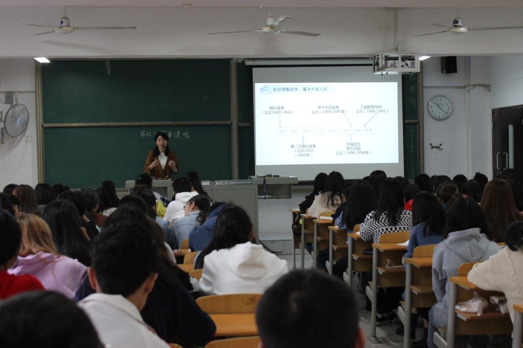 在接下来的时间,旷老师通过“没有鸦片战争就没有中国近代化”引申出“资本—帝国主义对中国的侵略到底给中国带来了什么”这一思考,正式开启了整堂课的教学。旷老师首先用时间轴的方式从宏观上把1840-1901年间我国遭受侵略的大事件进行了概述,让学生们对这段历史有一个整体性认识。紧接着她围绕军事侵略、政治控制、经济掠夺、文化渗透四个方面对这段历史进行了详实地讲授。尤其在讲到帝国主义在华的军事侵略中大量屠杀中国人民时,旷老师声情并茂地讲解,极富感染力的语言表达引起了同学们对遇难者的同情、对侵略者的愤慨。旷老师强调当今的世界依然不太平,但中国已不是过去任人宰割的中国,当代大学生应该以史为鉴,努力学习,只有这样中华民族伟大复兴的中国梦才能在大家的接力奋斗中变为现实。