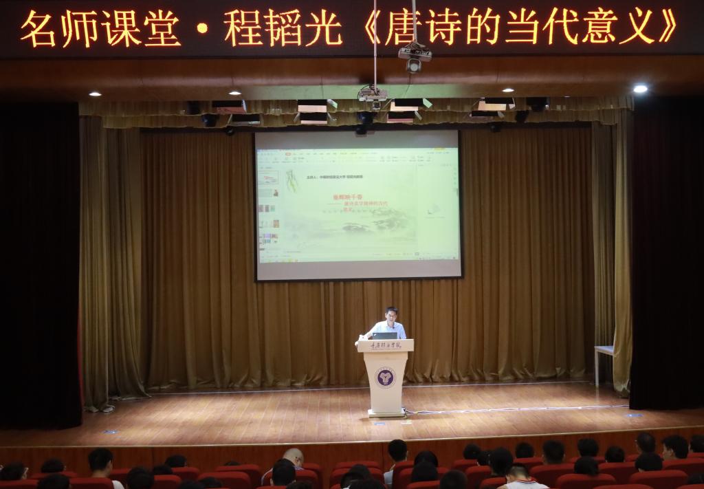 “明月当空洒银泄玉,中秋正至喜世悦人”九月的秋风吹走了中秋,伴随着中秋的离开,重庆移通学院迎来了一场唐诗美学盛宴,中南财经政法大学的程韬光教授于9月24日晚七点在下里巴人剧场,向移通学子讲授名师课堂《唐诗的当代意义》。