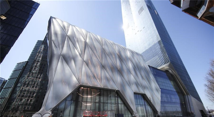由于“大松果”是纽约最热的景点之一,每逢周末“大松果”都挤到爆,它只能同时容纳1000人,所以需要票才能登楼,票是免费的,可以上网预定,也可以到现场领取。我们感到很庆幸,因为我们是工作日进来参观的,人不算太多,我们拿着票就立刻进去了,周末可能还需要等一阵子,这期间可以吃饭逛商店,不会浪费时间。坐落在“大松果”旁边的是另一幢设计很新颖的建筑,它是一幢可以伸缩的建筑,楼宇外部有一个移动外壳,通过大轮子滑动。这个外壳有着太空舱一般的质感,据说打开来可以成为观看演出的场地。这座建筑是文化中心,它有一个很怪的名字,叫“棚屋”(The Shed),从外形看的确有点像美国人后院里装园艺工具的棚屋,但它更像一个太空物体,文化中心里有各种展览,还有文艺演出。