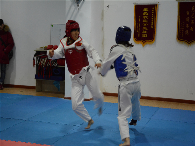 “哈!”一声有力的喊声打破了活动中心的沉寂,只见一个长相文静的女生一脚踢上了另一个女生的肩,却被另一个女生双手抱拳挡了下来,可是接着她却毫不犹豫地踢出了接下来几脚,速度愈来愈快,场面愈来愈激烈,所有观众都屏住呼吸,静静地看着这场武术之间的较量,当真是“巾帼不让须眉”!另一边男生之间的对决更加精彩,漂亮的过肩摔、刚健有利的出拳,精准刺激的扫堂腿,这是一场博弈,更是一种传承。汗水浸湿选手的道服,“礼仪,廉耻,忍耐克己,百折不屈这十二个字在选手身上得到最好的诠释。