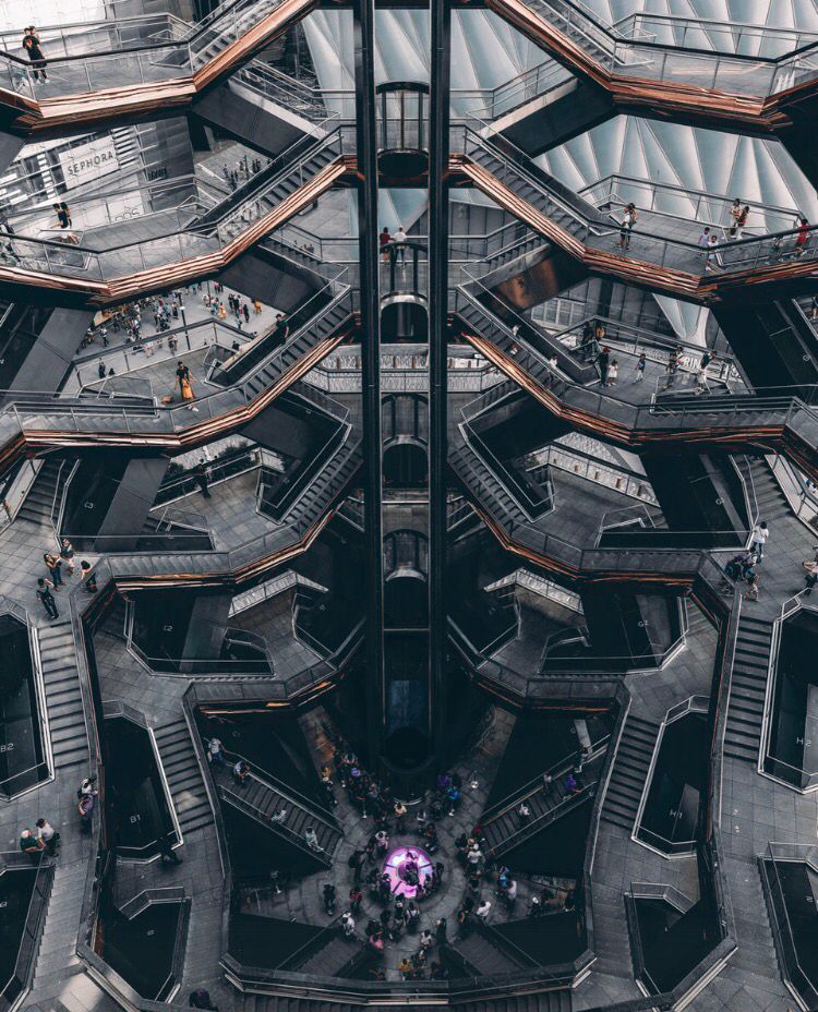 纽约新地标—大坚果(Vessel at Hudson yards),它位于美国纽约Hudson Yards。罕见的风格和独特炫酷的建筑物于纽约融为一体,再添一色。它奇形怪状的外观宛如蜂巢,所以被称作喔蜂状楼梯,是一座十六层高的连接楼梯,楼梯的不寻常形状意在使结构像“十二个月的圣诞树”一样突出,设计师的命名为:社交阶梯。理念意为一遍散步一遍交朋友。铜覆盖的台阶,像丛林健身房那样排列,并以印度阶梯井为模型。站在楼梯的顶部,你可以看到哈德逊河岸线的景色,可谓是状哉、美哉、悠哉。不管在哪一个高度或者角度放眼看曼哈顿都会给人不同的视觉体验和未来感。
