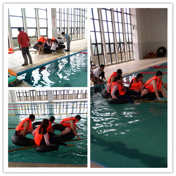 水上同舟共济活动中,队员分工协作,指挥着队员拿绳子绑,用竹竿支撑船体,试验强度与否,发布着一系列的指令。做好船,大家一起奋勇划着驶向彼岸,为了胜利,不断着喊着加油。挑战中,有的团队另辟新径,创新思维,合理运用资源,迅速的完成了挑战,也是团队智慧的体验。
