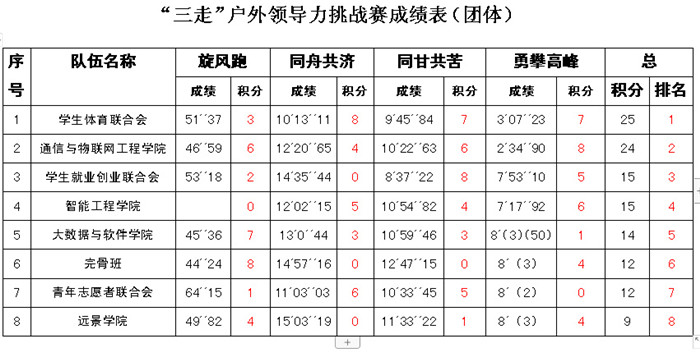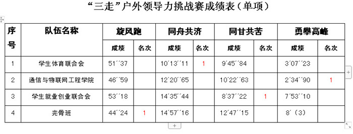 为进一步贯彻“三走”活动精神,使更多的学生“走下网络,走出宿舍,走向操场”,积极参与身心锻炼。6月19日,由竞技体育中心主办,拓展训练部承办的“三走”户外领导力挑战赛正式开始。本次户外领导力挑战赛以团队赛形式开展,有团队的领导者和执行者,拟在通过户外团队比赛,加强学生组织间沟通,提升学生领导能力与服从意识。