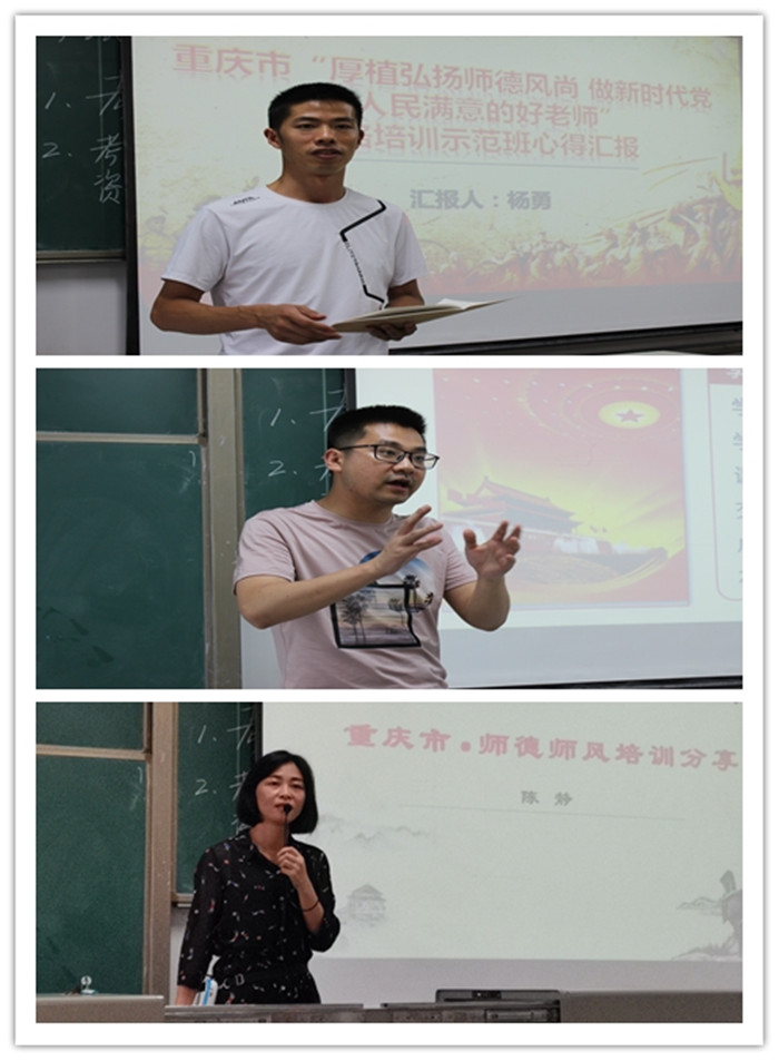 根据教育部教师工作司《关于举办“厚植弘扬师德风尚,做新时代党和人民满意的好老师”网络培训示范班的通知》(教师司函〔2019〕9号)的文件精神,我校思政教学部选派了杨勇、李阳、陈静三位老师参与此次培训。三位参培老师高度重视此项任务,十分珍惜这次难得的机会,历经近一个月的认真学习,均合格毕业。为了让更多老师了解培训内容,领会培训精神,6月19日下午4点,思政教学部在1305教室举行了关于此次培训的心得分享报告会,三位参培老师依次做了汇报,思政教学部其余教师认真聆听学习。