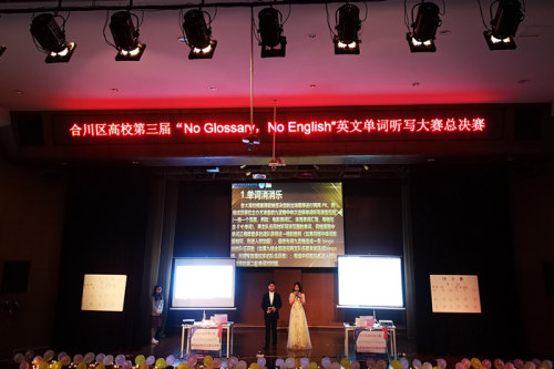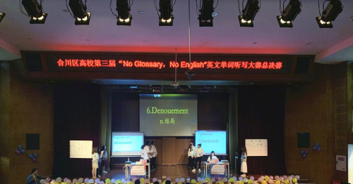 2019年5月29日16点30分,合川区第三届高校“No glossary,No English”英语单词听写大赛决赛在下里巴人剧场顺利举行。本次比赛邀请嘉宾有重庆邮电大学移通学院外语系系主任吴世银老师、外语系副主任罗琳老师、外语系副主任祝玮老师、英语教研室主任卢镜囡老师、公共英语教研室主任张旭宁老师、外语系英语老师李静老师、外教clive、外教christ,重庆工商大学派斯学院英语老师张志国老师,重庆师范大学涉外商贸学院、重庆工商大学派斯学院、重庆工商职业学院、重庆邮电大学移通学院主席团代表们。