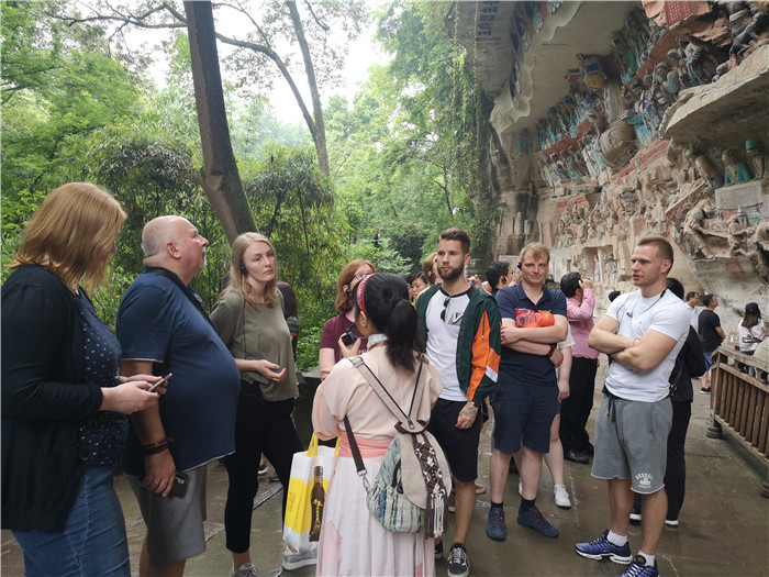 5月18日早上,绵绵细雨,我们和德国游学团来到了大足石刻中的的北山石刻,一下车,首先映入眼帘的一片竹林,本来还有一丝倦意的我们,一瞬间被这翠绿的大自然所吸引,变得更有精神起来。紧接着我们跟随着导游,在路上导游也在向我们介绍北山石刻的来历和各种雕塑的蕴意。导游向我们介绍到北山石刻公元9世纪末的晚唐造像题材有12种类型,以观音及观音、地藏合龛和阿弥陀佛胁侍观音、地藏居多。造像端庄丰满,气质浑厚,衣纹细密,薄衣贴体,具有盛唐遗风。连德国友人都惊叹于这绝伦的工匠手艺。一丝不苟的在欣赏这宏伟的佛像。
