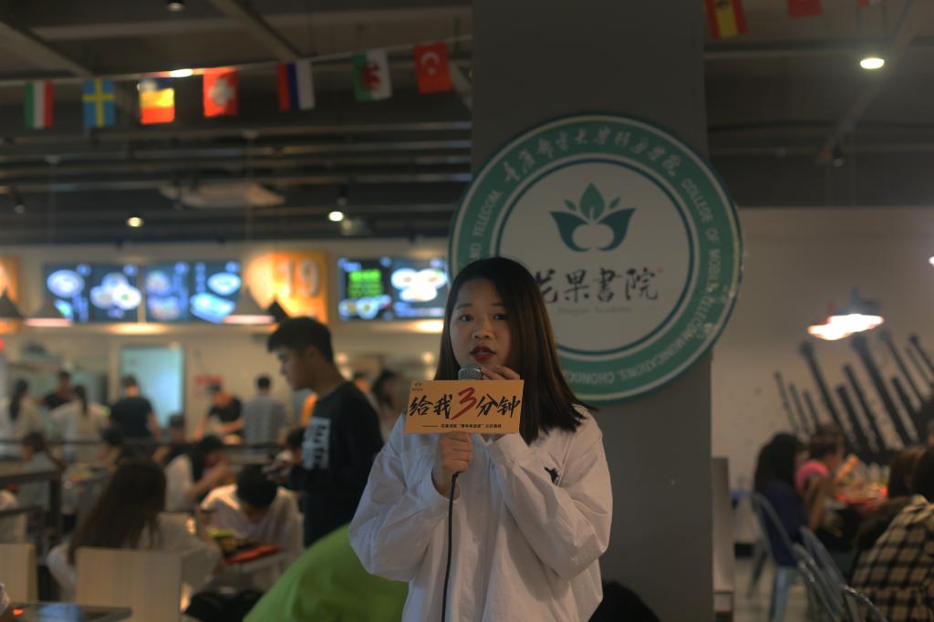 正逢吃午饭的高峰期,食堂人声鼎沸,大家都时不时好奇地望向活动现场。不难看出演讲者们有些许紧张,对于在这么多人的地方进行演讲似乎还有些不适应,但“给我三分钟”公路演讲正是给他们提供的一个平台,通过这样的活动形式去鼓励当代青年勇敢地表达自己想法,从而进一步提高自身的感召力和感染力 。