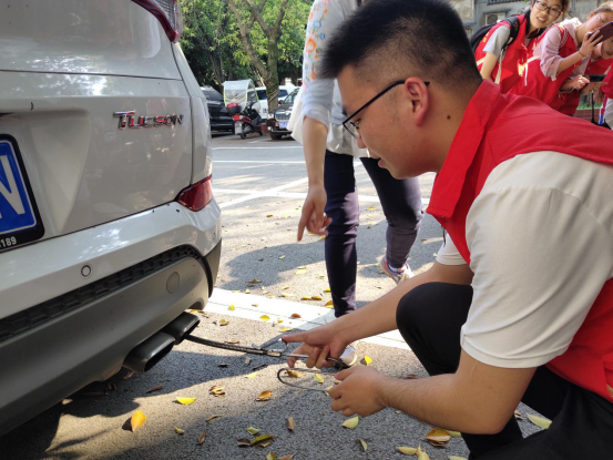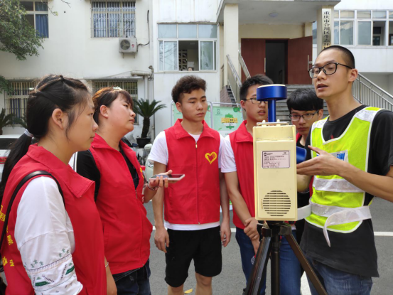 在参观环保仪器的过程中,由检测站的工作人员们向志愿者们进行讲解,如何使用机器进行汽车尾气监测、环境噪音监测以及大气污染监测。在工作人员们的详细讲解以及动手示范后,志愿者们大致明白了基本操作流程。比如监测噪声时,需要先在机器上设定时间,然后通过加权计算得出结果,最后再查看LEQ值,观察是否超标。