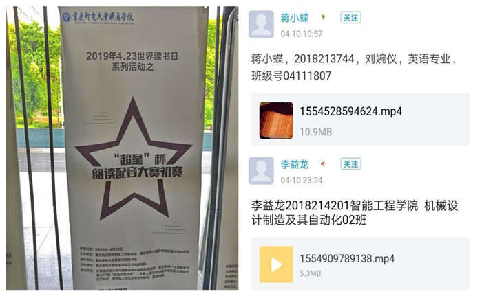 经过全校读者的参与,一共收到70余件配音作品,由艺术传媒学院专业老师评审出一二三等奖,并将推荐1-2件优秀的作品参与重庆市社会力量办学院校图书馆“超星”杯配音大赛决赛。
