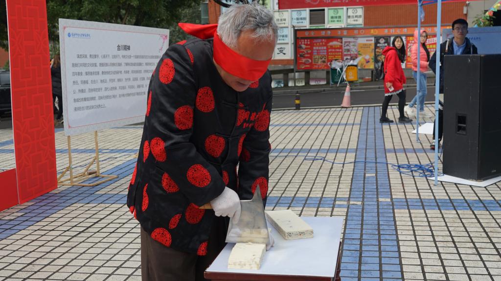 在一段精彩的即兴演讲结束后,余晓华先生现场为大家展示手工制作桃片的各类工具,讲解桃片的制作过程并现场为大家带来蒙眼切桃片的精湛刀工。这位穿着传统服饰、蒙着眼、唱着小调的传统文化守护者给现场所有学生都带来了极大的震撼,同时试吃环节同学们都对现切的桃片赞不绝口。余老先生表示,看到这么多学生对于这样即将在工业化社会被时代所抛弃的手工小吃产生的关注很有感触,觉得看到了传统文化传承的希望。