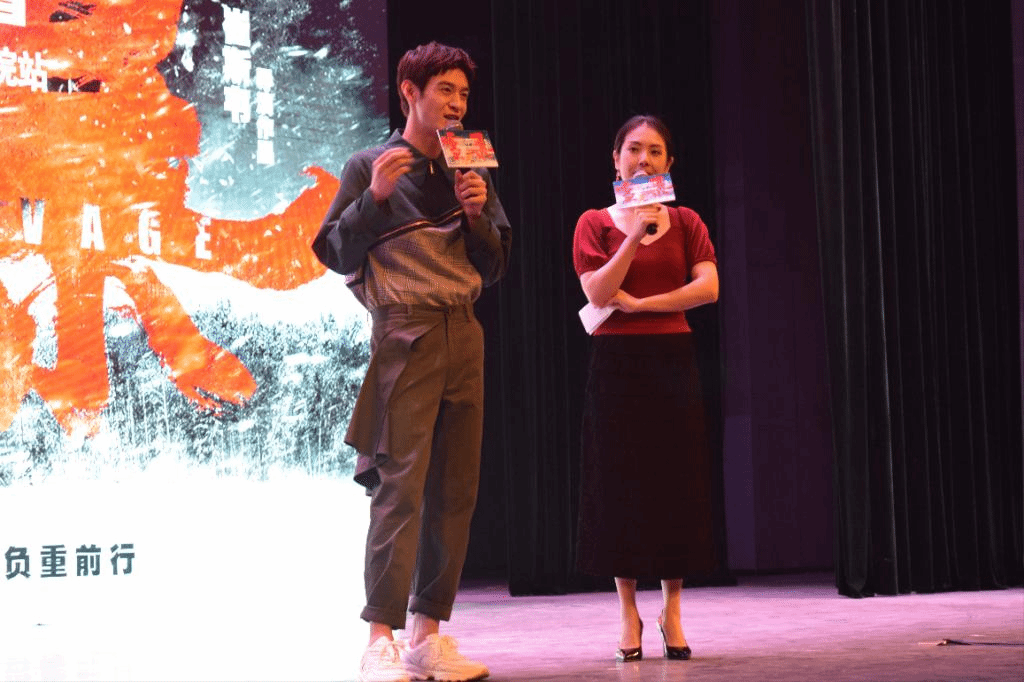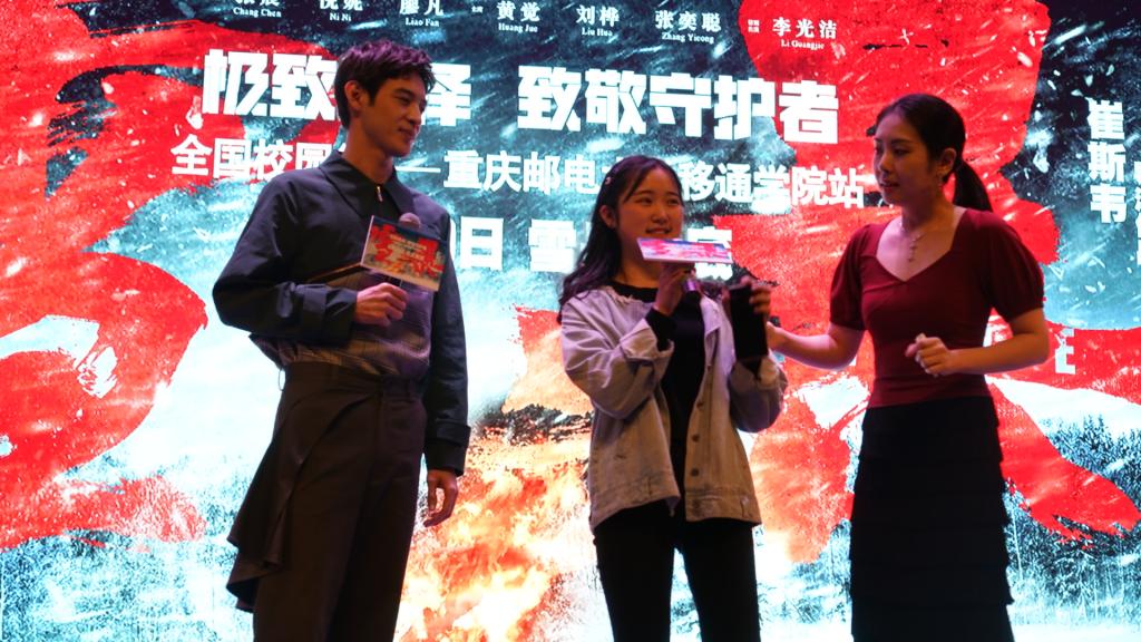 在结束了观影之后,电影的主创们也和同学们进行了面对面的交流。在互动环节一开始,就有一位同学热情的邀请主演张奕聪说:“您是第一次来重庆,可以和我学一句重庆话吗?勒是雾都!”“勒是雾都!”“您可以和大家分享一下拍摄中难忘的细节吗?”张奕聪说:“我们每天要爬3000米左右的雪山,在零下42度的极寒环境中,觉得我们真的要向森林警察致敬,因为他们每天都坚守在这样的岗位上,非常不容易。还有就是手指骨折,当时没有意识到,觉得还是要把戏拍完。”同学们响起了热烈的掌声。