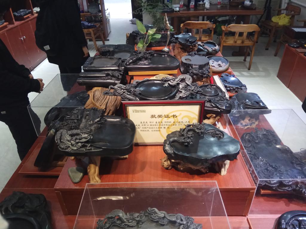 就在今年,易老师创作的砚台‘二龙戏珠’在第54届全国工艺品交易会上获得了“金凤凰”创新产品设计大赛银奖。一颗匠人之心推动着他不断前行。深入砚台之旅,易老师还为大家讲述了砚台从古至今的发展史。合川峡砚雕刻技艺始于宋代,盛于明清,历史悠久,要完成一件合川峡砚,需经原石开采(洞采)、选料、构思、绘图、初步造型、精细雕刻、打磨成品、打蜡抛光等十余道工序,采用打、凿、刻、挖、钻等多种技法,根据花纹复杂程度,花费时间在几天到几月甚至一年不等,每一道工序、每一种雕刻技法,都是用时间和汗水换来的。谈及创作时,易老师说到自己在继承传统砚台制作技艺的同时,不断改良,现有的展品大多都融入了合川特色。他将砚台的实用性和艺术性做了很好的结合,达到了可观性与可用性的有效统一,推动了砚台制作工艺的不断发展。