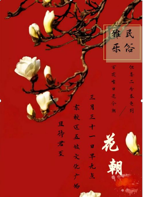 花朝节又称花神节,每到农历二月,人们结伴到郊外游览赏花,称为“踏青”,姑娘们剪五色彩纸粘在花枝上,称为“赏红”。2019年3月24日,为增强我校师生对中华民族传统节日的了解,我校华韵汉服协会邀请同袍们穿上美丽的汉服,通过回顾典故、感受风俗等一起领略花朝节的不同魅力。