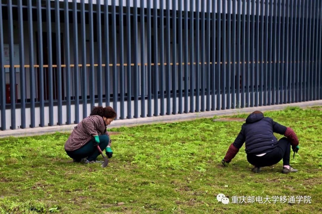 环卫人员细心的清理着草坪上的杂草