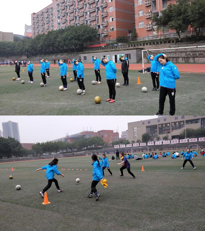 之后在分组的基础上进行围圈抢球的训练,随着队员们的默契度越来越高,打出不少漂亮的配合,将圈内抢球的人遛的团团转。队员们两两分组,进行行进间的远距离传球和定点的远距离传球。期间教练在旁不断对队员们的脚法进行纠正和提醒。