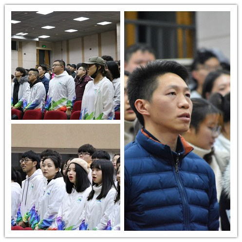 最后,全体师生起立奏唱艺术传媒学院团总支、学生会会歌,希望大家如同歌词中那样“不怕风和雨,期待笑和痛”。
