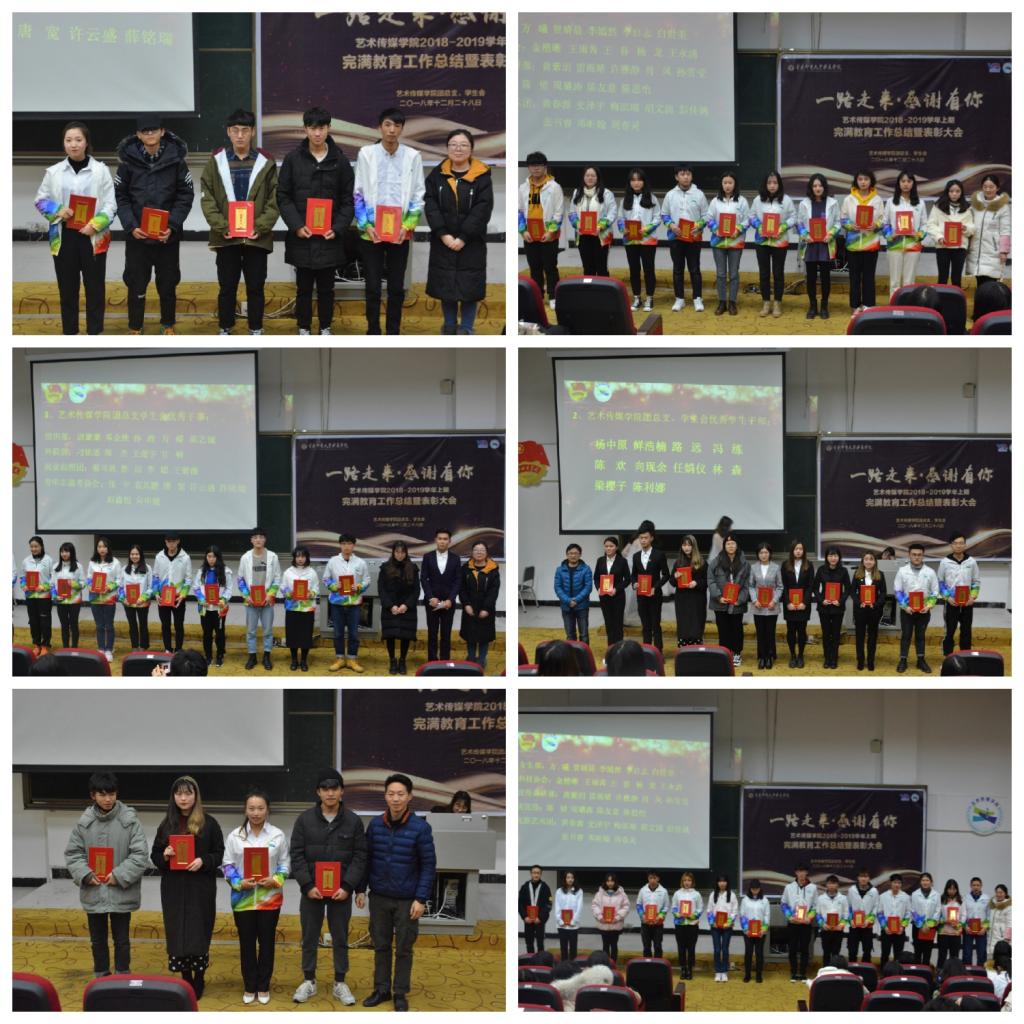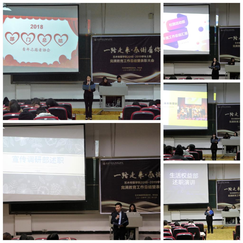 会上也对艺术传媒学院2018-2019学年上期在完满教育工作中表现突出的先进集体以及个人进行了表彰。分别表彰了学期团总支学生会优秀部门、优秀干部以及优秀干事,希望同学们以他们为榜样,不忘初心,继续前行。同时本对学期各基层团支部积极开展完超活动的先进单位进行了表彰,通过评选、答辩展示等方式对完满超级团支部进行了评选,并进行表彰,促进了基层活力提升,也促进了交流。