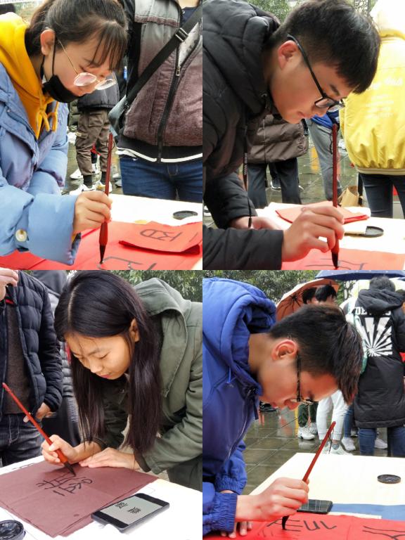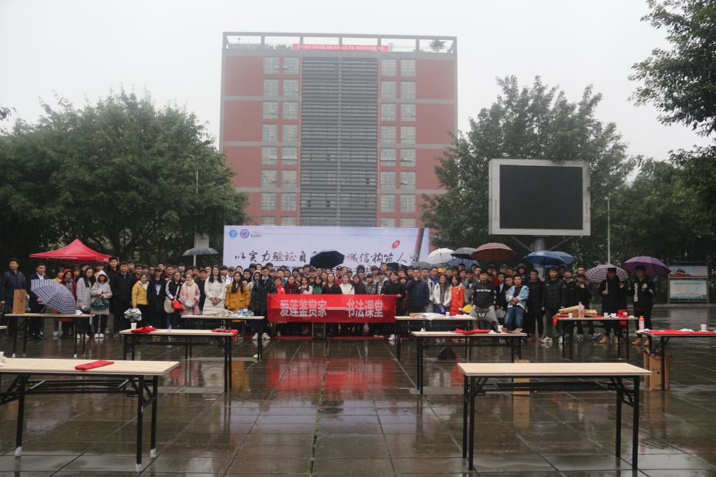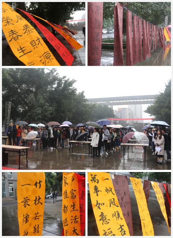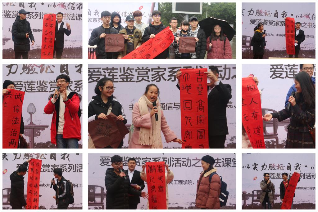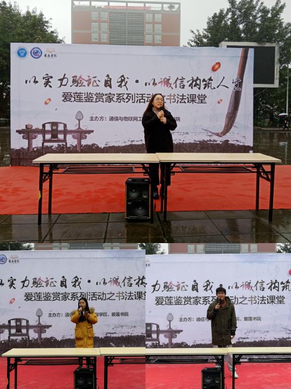 为集中展示六次书法课的成果,同时加强同学们对诚信的认识,爱莲书院联合合川区书法家协会、通信与物联网工程学院通信工程专业于2018年12月25日中午在黄桷书广场开展了本次“以实力验证自我,以诚信构筑人生”为主题的书法课堂总结展示活动。参加本次活动的老师有合川区书法家协会苏燕老师、仇山川老师,爱莲书院综合办公室主任孙佳婧老师、发展导师金鑫老师、通信与物联网工程学院辅导员苏盼盼老师。