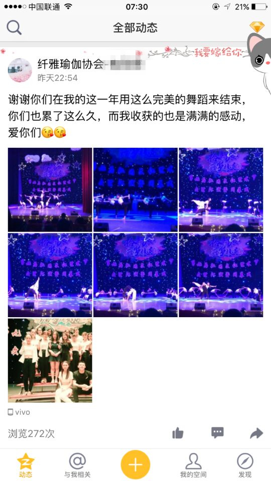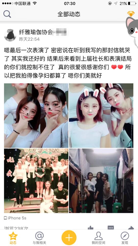 她是瑜伽协会的社员,平时抱怨过训练很累,节目一遍又一遍彩排很枯燥,但在每一次上场前都仔细回忆动作,生怕哪里出了错。在最后文艺汇演的大舞台上,完美演出后开心的像个孩子,她觉得一切都是值得的,和瑜伽的小伙伴一起,把最美的表演呈现给大家。