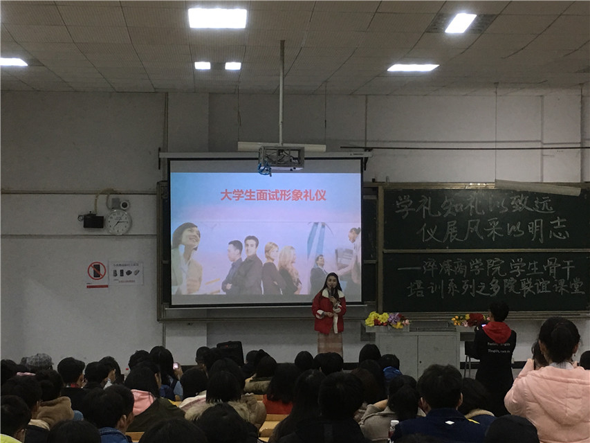 对于即将踏入社会的大学生,面试是不可忽视的环节之一。面试礼仪作为一个加分小技巧,是需要大家注意,但又容易被忽略的细节。因此,为了让大家提前了解面试礼仪在职场中的重要性,以及让大家知道在面试需要注意的礼仪,11月18日,在3103教室,外语系邀请到国际注册礼仪讲师、重庆市多个企事业单位高级礼仪讲师,同时也是合川区就业创业公共服务中心资深礼仪专家张颖老师为外语系学生骨干进行一场职场礼仪培训。