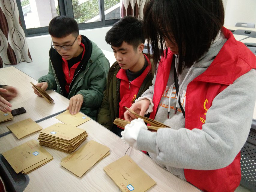微风温柔地拂过每个志愿者恬静的脸庞。下午四点,整理收发室活动还未开始,志愿者们就整装待发。在等待的这段时间里,他们询问着这项志愿活动的日常工作,大家也带笑地互相问候,有礼有节但不显拘谨;随后大家一起接过红马甲并穿上,成为这青青校园里最美的一抹亮色和秋季里最美的红叶。